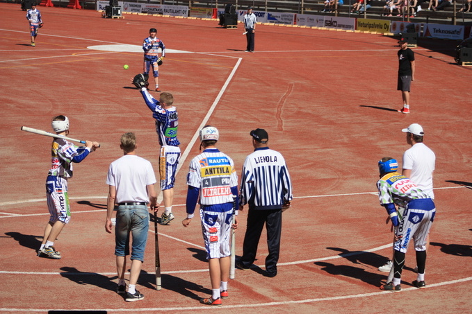 ![]() Aulis Karvonen, vuoden lukkari ja pesäpalloilija vm. -67, kättelemässä avausheiton vastaanottanutta Joona Lehtistä. |