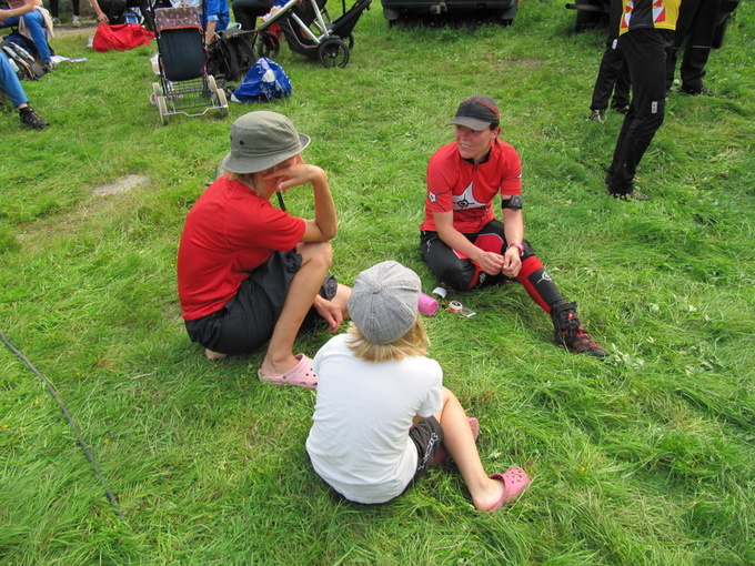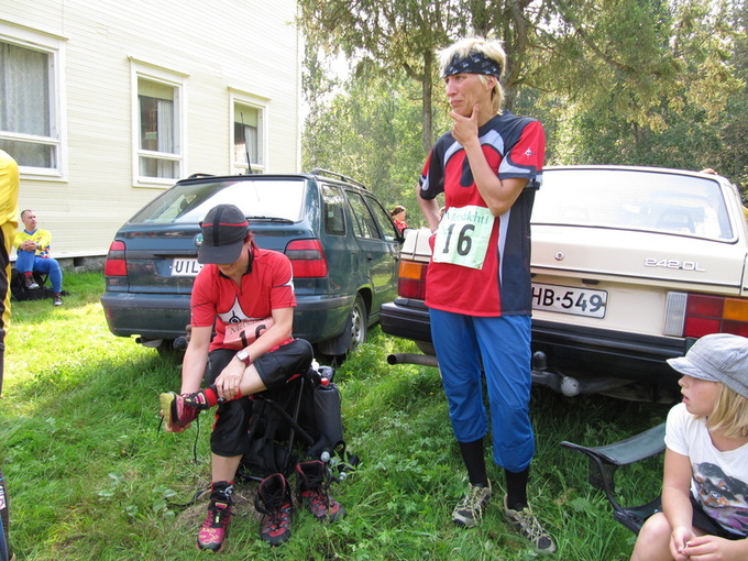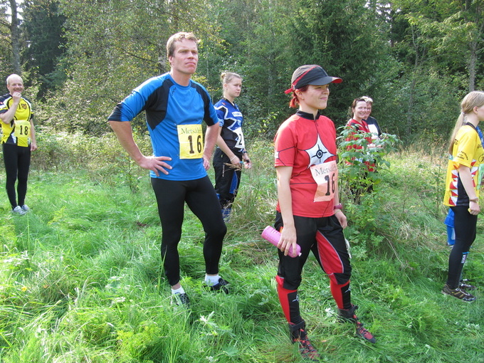 Seuraavien osuuksien juoksijat valmistautumassa. Koskelan Tiina näyttää kovin mietteliäältä.